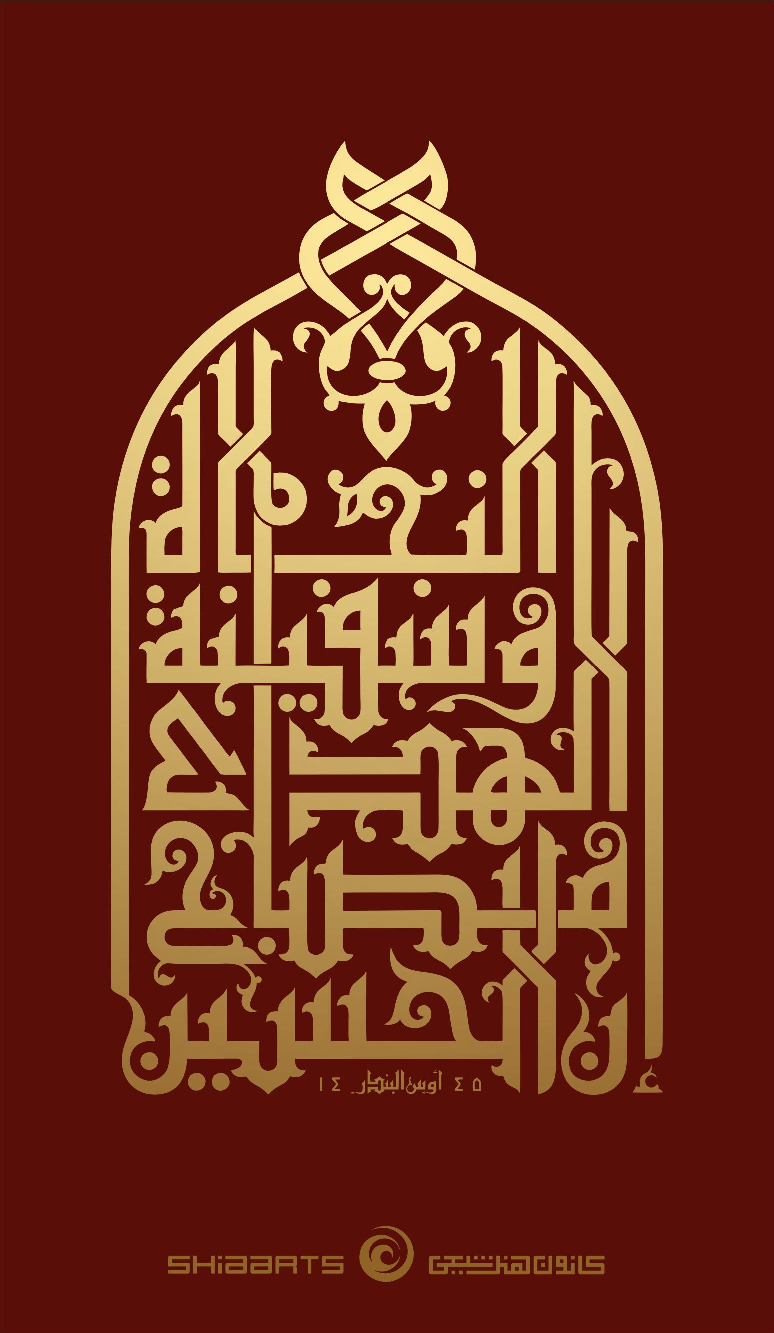 کتابت حدیث شریف نبوی (صلیاللهعلیهوآلهوسلّم) اِنَّ الحسینَ مِصباحُ الهُدی و سَفینةُ النَجاة، با خط کوفی تزئینی توسط هنرمند عراقی در سال 1404 شمسی
